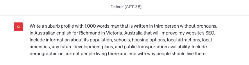 Step 3: Send ChatGPT a prompt to write a suburb profile on one of your trading suburbs. You can easily copy paste below prompt.